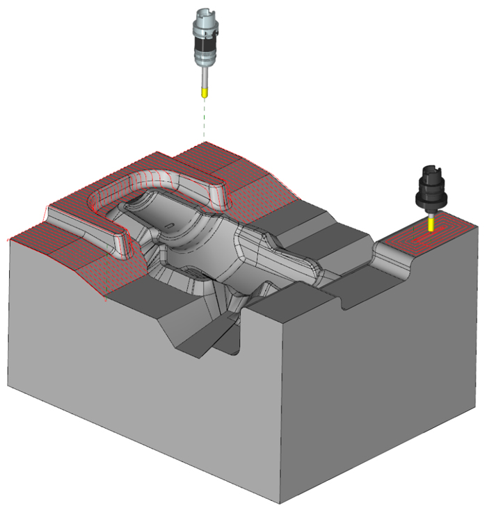 Maximize part quality and minimize bench work by remachining areas where the nose radius of the finish cutter could not follow the surface. ESPRIT’s remachining cycles automatically calculate where material remains from larger cutters and creates toolpaths for a smaller cutter to finish only these areas. Remove material in tight places without the risk of tool breakage with strategies for vertical corners, horizontal corners, and pencil tracing.
